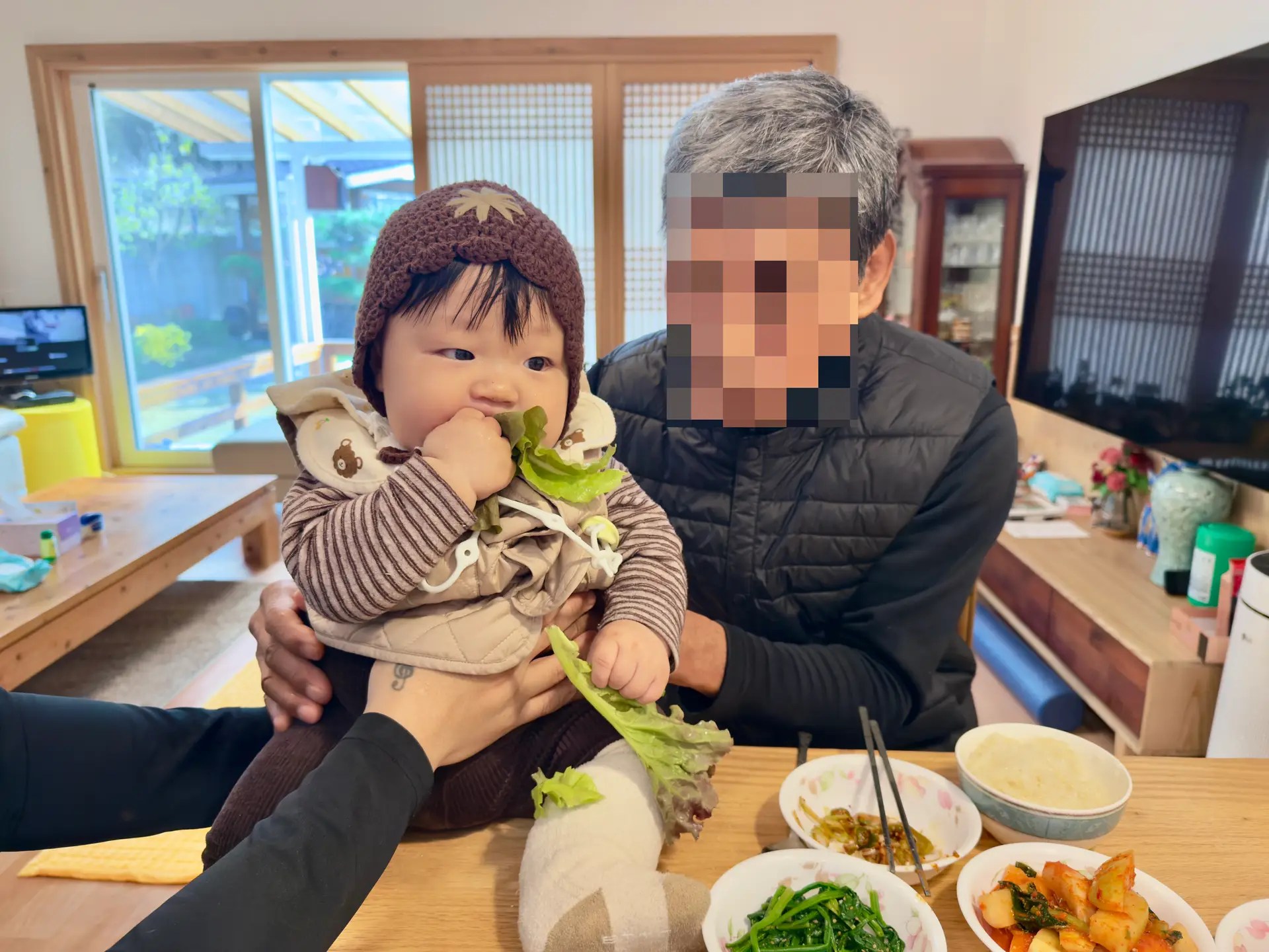 점심 삼겹살을 굽고 먹는 중, 크림이가 손으로 상추를 뜯어먹는데옆에서 외할아버지가 “아이고 우리 귀여운 손주!” 하며 흐뭇한 눈빛을 보내고 있는 모습이 정말 따뜻했습니다.
